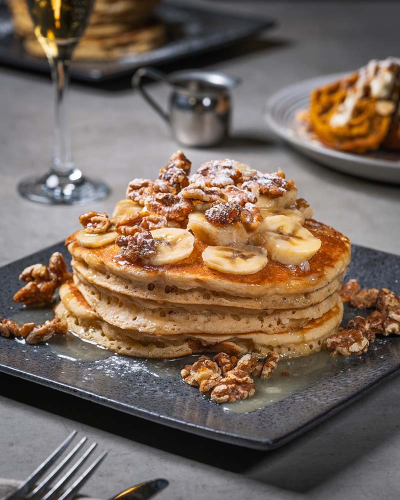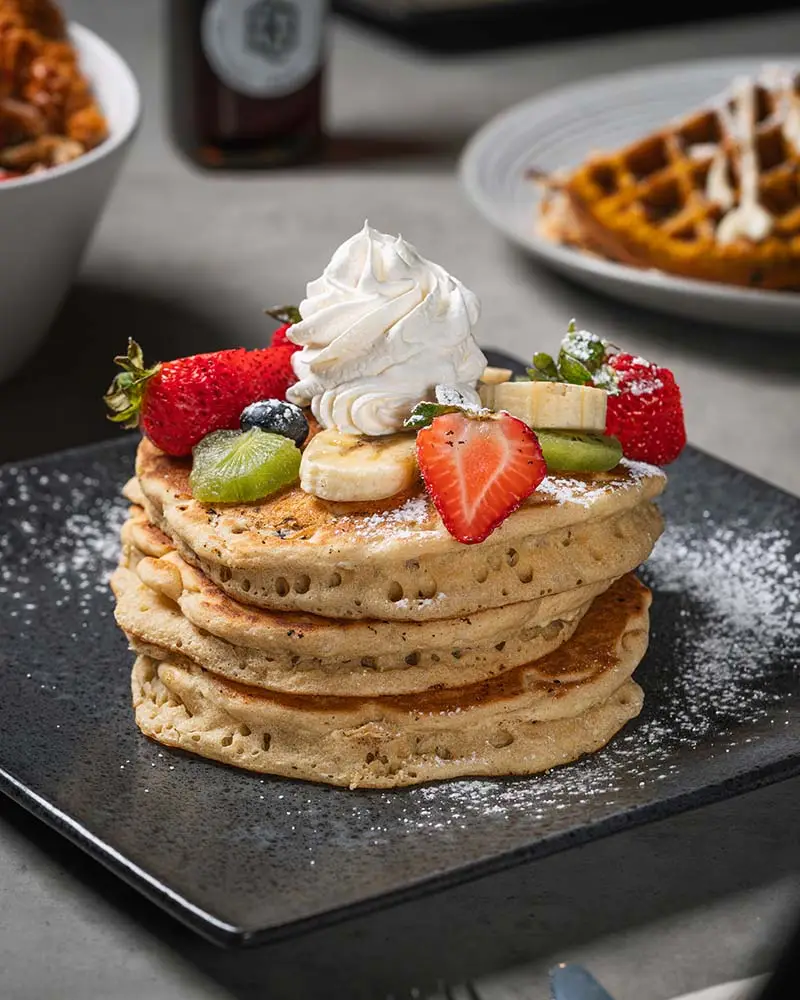 Fluffy pancakes, topped with bananas, strawberries, kiwi, blueberries & powdered sugar. Add: Nutella: $1.50 | Whipped Cream: $1.00 | Chocolate Chips: $3.00