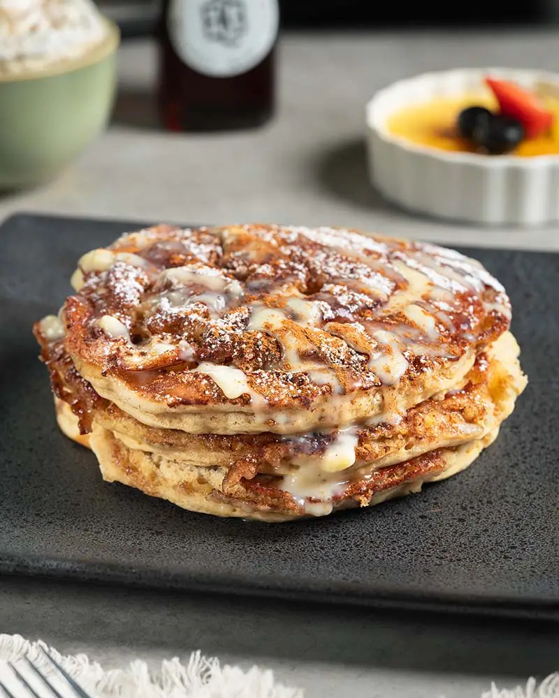Fluffy pancakes topped with glaze, cinnamon & powdered sugar.
